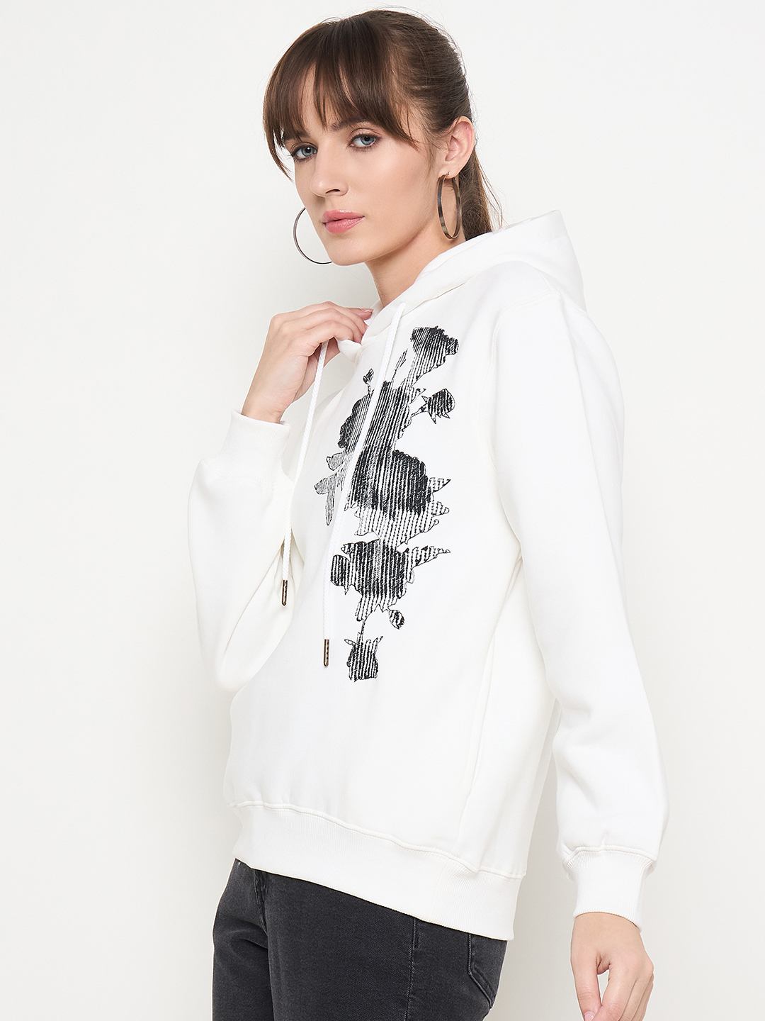 Madame Floral Print Adorned Cotton Blend White Sweatshirt