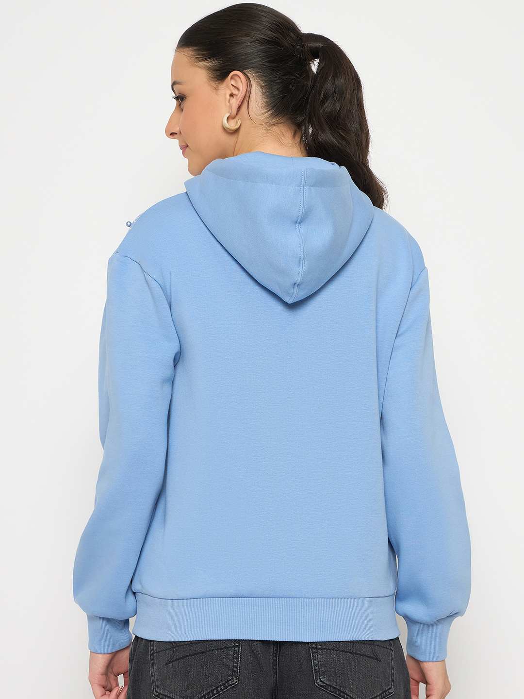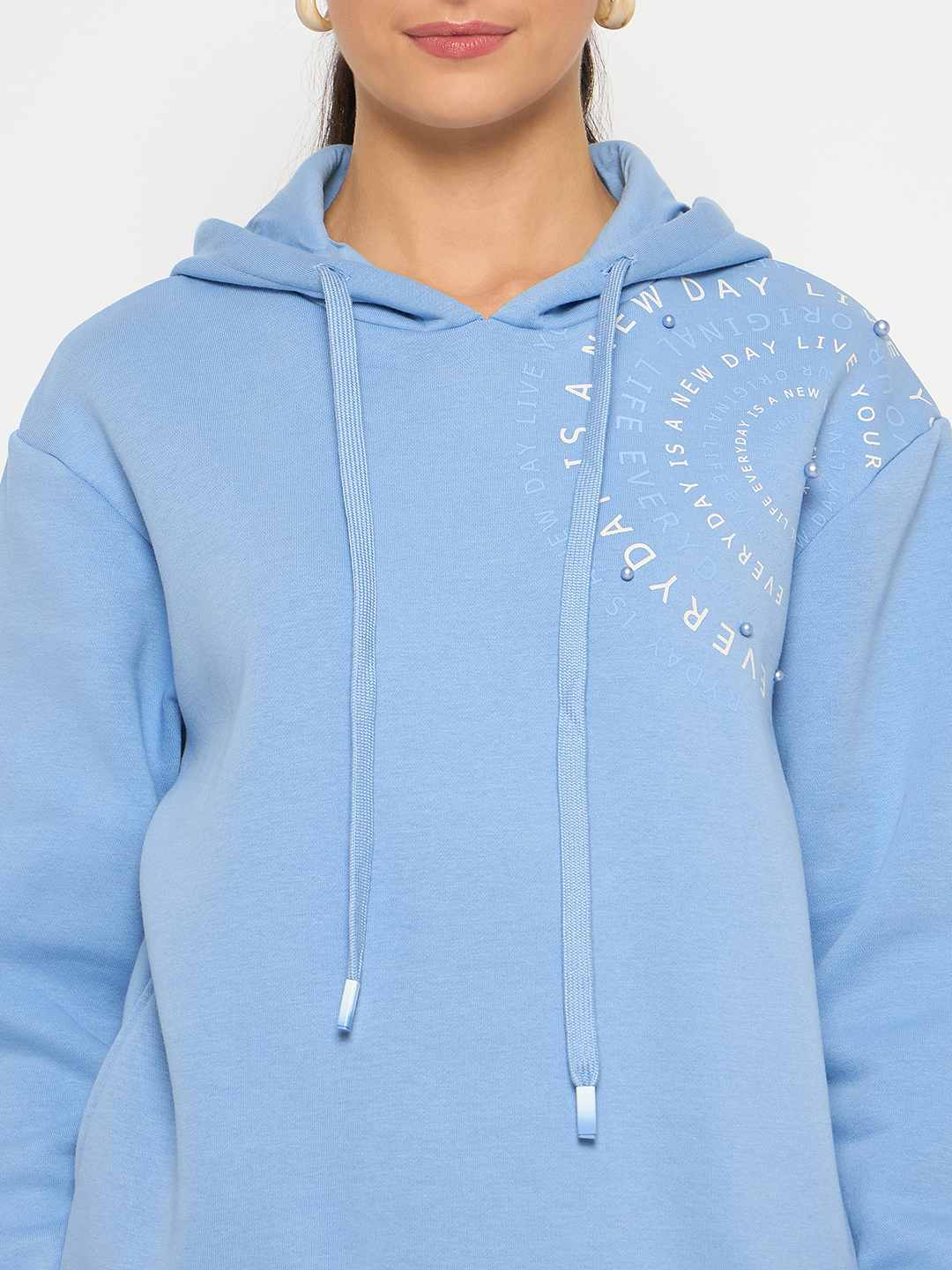 With its versatile style and eye-catching print, this stylish sweatshirt features a unique placement print paired with elegant pearl detailing, adding a touch of sophistication to a relaxed silhouette. The powder blue hue offers a fresh, versatile look, perfect for layering or wearing on its own. Whether you’re lounging at home or stepping out for a casual day, this sweatshirt combines comfort with chic appeal. Perfect for any season, it’s a must-have addition to your collection. Ideal for fashion-forward women seeking both style and comfort.